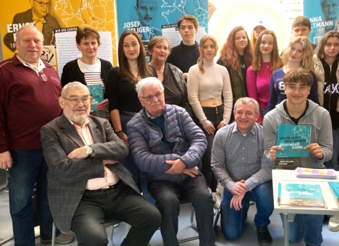 Erwin Hadwiger (sitzend 2.v.li.) bei einer Ausstellungspräsentation 2023 in den Privaten Schulen Breitschaft in Regensburg – eine der Ausstellungs-Rollups beschäftigte sich mit dem Künstler Georg Hans Trapp