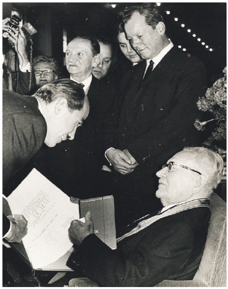 Ein historisches Foto: Der damalige Vizepräsident und spätere Präsident der internationalen Paneuropa-Union, Otto von Habsburg (links), überreicht in Berlin als Vertreter des Präsidenten Richard Coudenhove-Kalergi an den ersten Präsidenten der Paneuropa-Union Deutschland und ehemaligen Reichstagspräsidenten der Weimarer Republik, Paul Löbe (SPD) eine Urkunde, in der dieser am 14. 12. 1965, seinem 90. Geburtstag, zum Ehrenpräsidenten der Paneuropa-Union Deutschland ernannt wird, deren Gründungsvorsitzender er 1925 war. Rechts daneben steht der Regierende Bürgermeister von Berlin und spätere Bundeskanzler Willy Brandt. (Das Bild verdanken wir Gergely Pröhle von der Otto-von-Habsburg-Stiftung in Budapest).